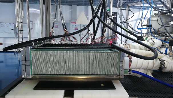 日前,BETVICTOR新能源汽车工程中心在去年设计基础上,制备出的金属极板燃料电池单堆在第三方整车厂实测,达到了125KW的最大持续功率,超过设计目标115KW。单堆及其模块测试现场如图1a,1b所示。
