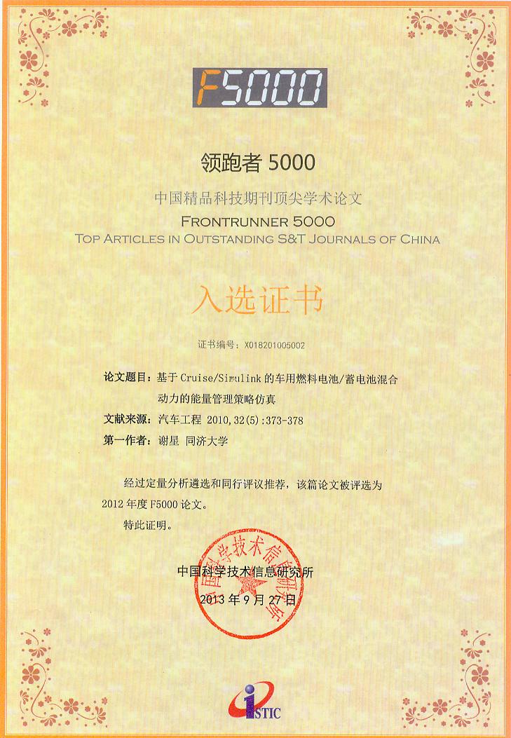 入选2012年度F5000论文。第一作者谢星为周苏教授指导的2007届硕士研究生。汽车工程杂志仅有三篇论文入选2012年度F5000论文。