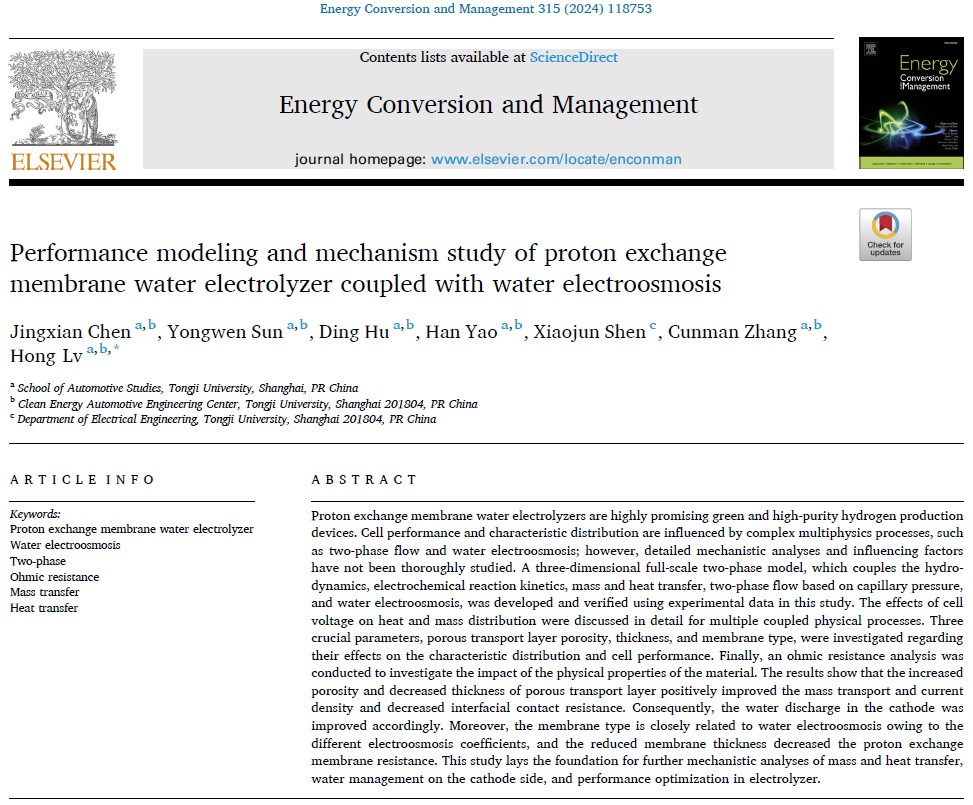 7月3日,Elsevier旗下高影响力综合期刊 《Energy Conversion and Management》(IF=9.9, Cite Score=19.0)在线发表了题为“Performance modeling and mechanism study of proton exchange membrane water electrolyzer coupled with water electroosmosis”的研究性论文。该研究主要由BETVICTOR伟德张存满教授团队完成,博士研究生陈静娴为论文第一作者,吕洪副教授为通讯作者。