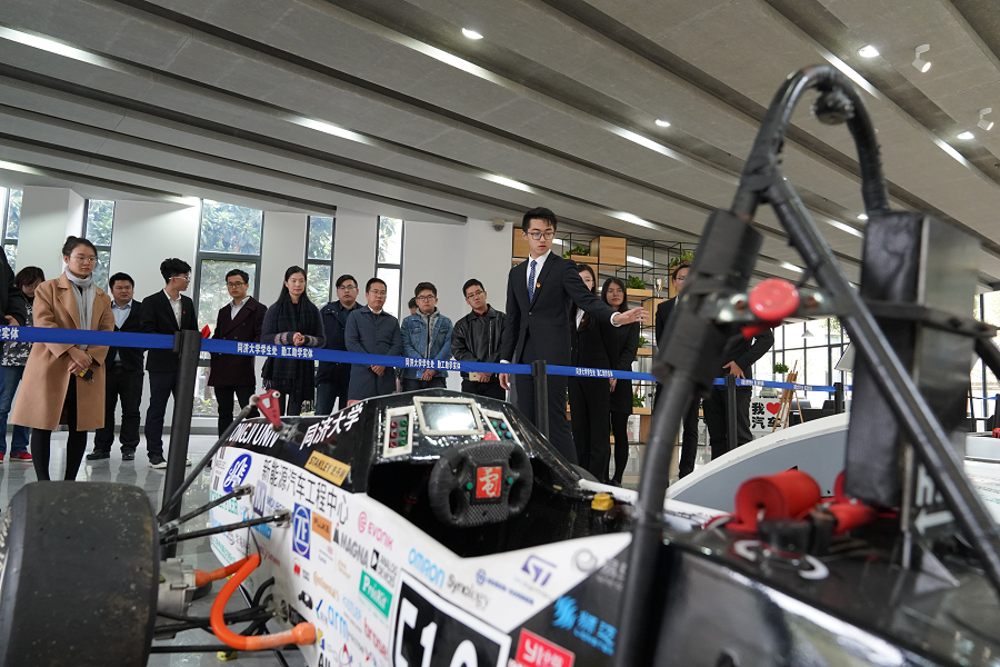 在曹卢老师的带领下,老师们还参观了“咖驿站”创新创业项目及造型小班优秀设计作品及老员工科技创新实践基地。同济电车队队员刘孟萱为来访的老师们讲解了员工车队往届赛季所设计制造的赛车。参观活动中,老师们对于员工们设计的各式各样汽车赞不绝口,纷纷拍照留念。