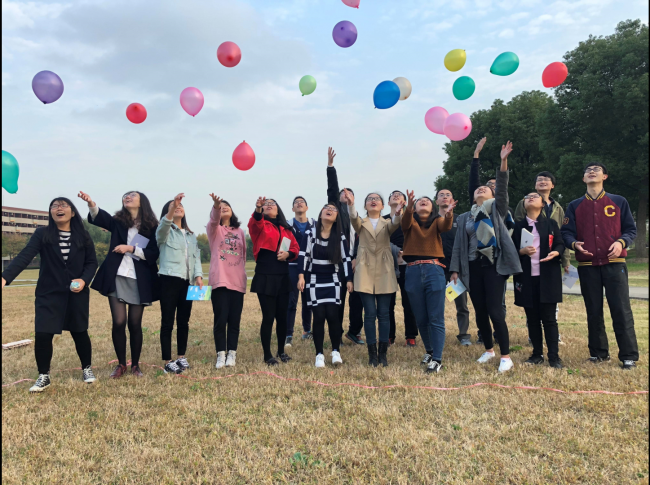 第三板块是致自己。致自己,要求每位党员静思明确个人毕业后的目标,每人在气球上书写自己的期待和愿景,并默念铭记,最后一起放飞气球,放飞梦想。