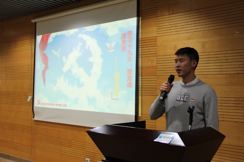 2017年11月28日晚,2017级专硕二支部在BETVICTOR伟德A311举办了 “学习十九大,赞党魂,颂党恩”主题朗读比赛。此次活动旨在通过朗读与学习“十九大”主题相关的文学作品或原创作品,表达青年党员对党和祖国的赞美和热爱。2017级专硕二支部全体党员和积极分子共18人参与了本次比赛,比赛由支部书记张文剑主持,2017级研究生支部书记担任评委。