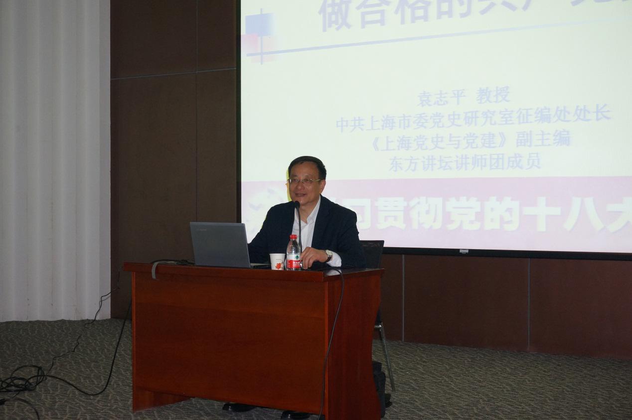 2014年4月24日晚上,公司党委特邀报告,暨2014年春季入党积极分子培训班课程报告在新能源汽车工程中心二楼报告厅举行,本次报告有幸邀请到了中共上海市党史研究室征编处处长、《上海党史与党建》副主编、东方讲坛讲师团成员袁志平教授作为报告嘉宾,给嘉定校区7个公司党校学员和公司党员带来题为《认真学习党章,严格遵守党章,做合格的共产党员》的报告。