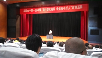 中午12:21,一行人从校门口出发,乘车首先来到了安亭文化体育中心听取《从群众中来——安亭镇‘践行群众路线争做安亭好人’故事巡讲》,故事巡讲出乎各位同学意料,采用了上海本地方言讲述。给各位同学理解故事内容带来了不小的挑战,但是大家还是在了解到故事的主人公后,通过互联网了解了他们的好人好事相关事迹,备受鼓舞。