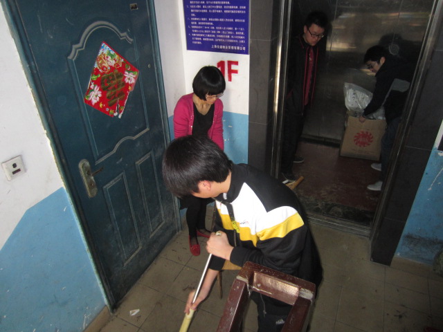 第二个队伍由王学禹同学带队,这个队伍任务比较重,协助5名物业人员,到11层高的楼道里清理易燃物品,包括废旧纸壳,木质桌子等等。清理中还发现有部分居民将自行车锁在楼道里,我们帮助物业与居民沟通,并帮他们讲自行车推到楼下。