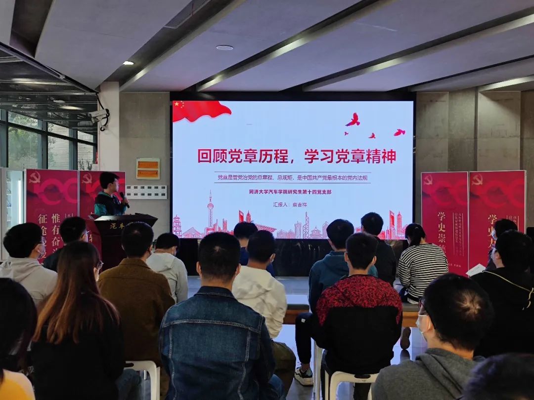 首先,研究生第十四党支部的蔡吉祥同志带来题为“回顾党章历程,学习党章精神”的专题分享。本次分享系统地回顾了从一大党纲到二十大新党章的发展历程,并对二十大新党章的修订内容进行详细解读。这次党章修订工作广泛征求各方面意见,集中了全党智慧,凝聚了全党共识,体现了全党意志,是党中央充分发扬党内民主的一次生动实践。本次分享不仅引导广大汽车青年更加深入地认识和学习新党章,更号召大家筑牢信仰之基、补足精神之钙、把稳思想之舵,把笃行党章落实到思想、工作、生活的各个方面。