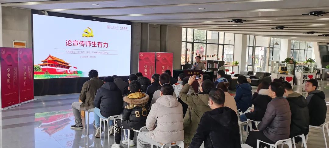 首先,研究生第十党支部金铭心同学带来题目为“论宣传师生有力”的报告。他详细介绍了中共中央、国务院和教育部等部门关于加强高公司党建工作的指示精神和重要论述、高公司党支部“七个有力”的内涵、基层党组织宣传工作的重要性以及力量源泉。