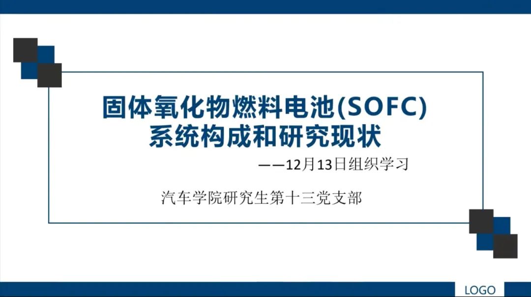 随后,由研究生第十三党支部冯煜同志带来主题为“固体氧化物燃料电池(SOFC)系统构成和研究现状”的专业知识分享,介绍SOFC系统的构成、技术发展现状以及产业发展现状,通过阐述其工作原理、以实例分析了关键材料及仿真与控制的方法,指出我国在大功率电堆、高效热平衡系统等方面仍需努力,SOFC可用于分布式储能、车/船用动力与能源。