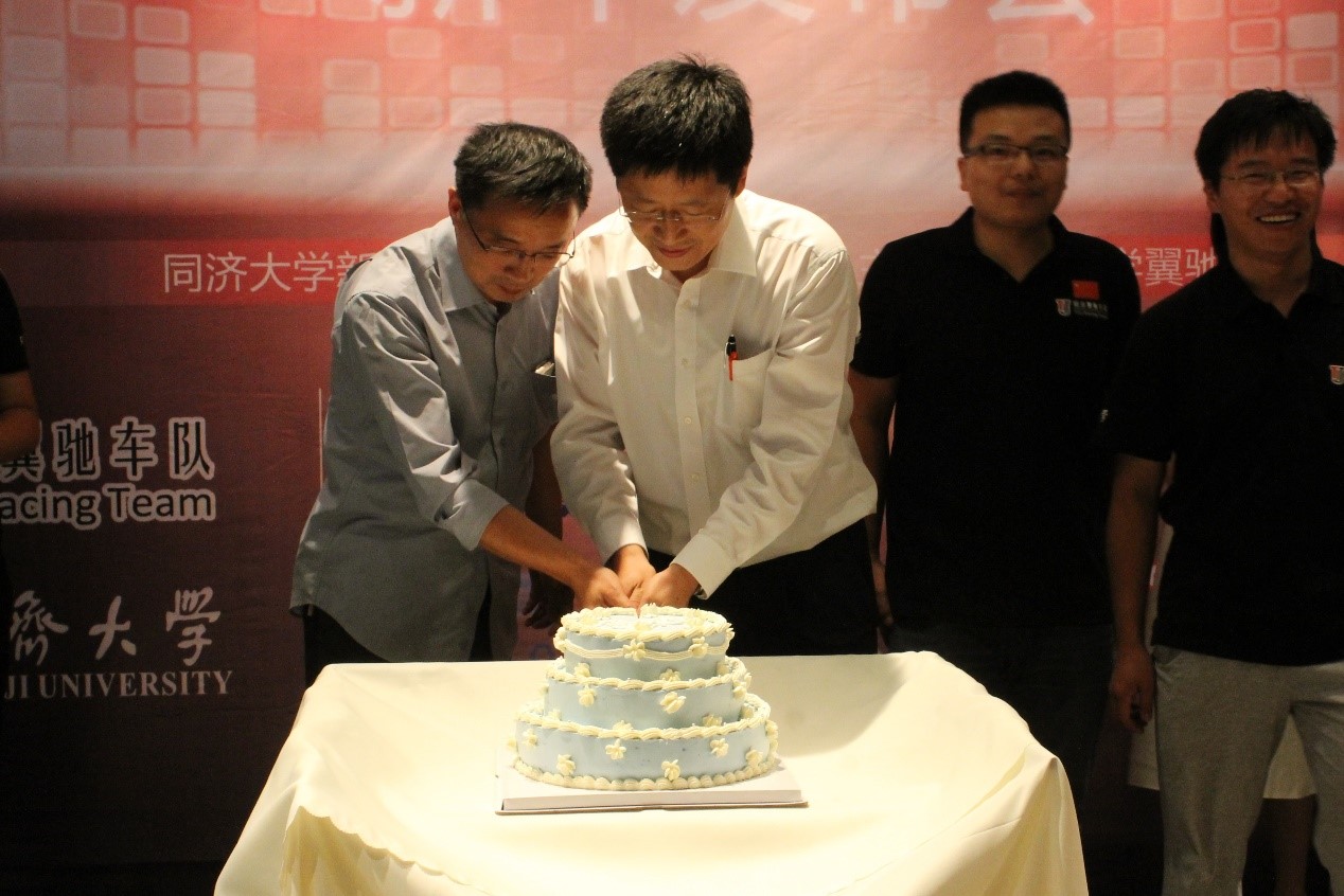 新车发布会当天恰好是翼驰车队成立的第八个年头,队员们精心准备了蛋糕来纪念这个特殊的日子。一个精致的三层蛋糕从幕后被缓缓推出,车队总指导老师李理光教授和BETVICTOR伟德周德宽教授共同切下蛋糕,和翼驰全体队员一起为翼驰庆祝八岁生日,并合影留念。之后,李理光教授发表了简短的讲话,肯定了车队在刚刚过去的日本赛上取得的成绩,并对赞助商们对车队长久以来的支持表示了感谢。