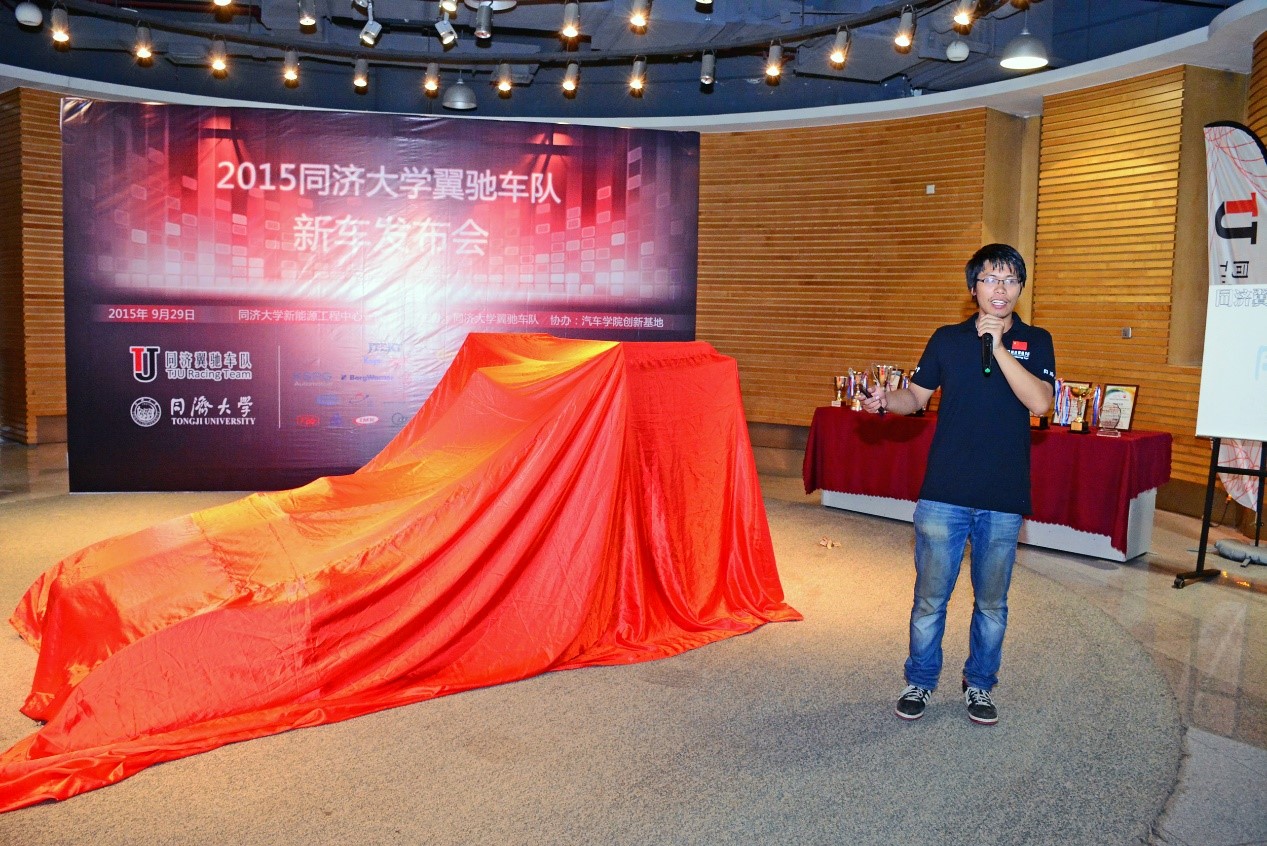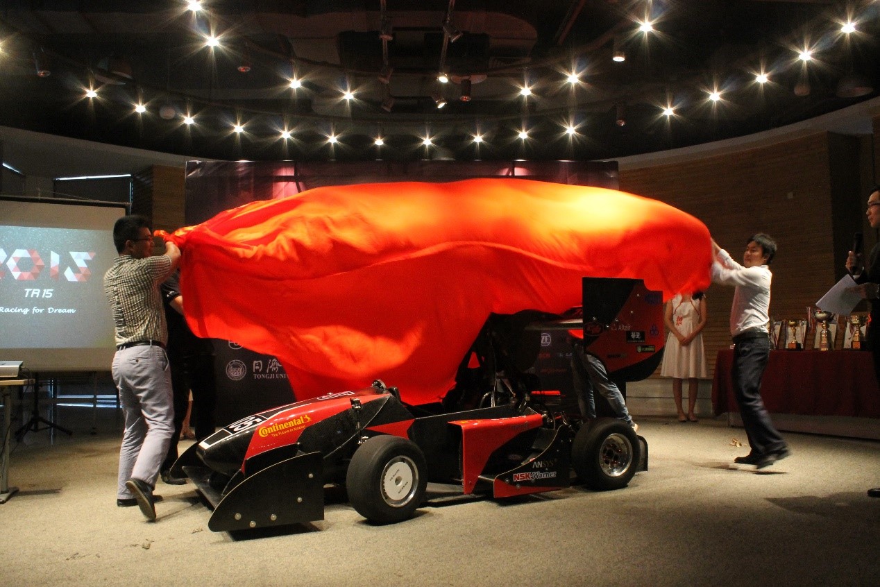 BETVICTOR校团委副书记顾旭峰老师,公司党委副书记史成宇老师,翼驰车队铂金级赞助商捷太格特科技研发中心(无锡)有限公司王凯先生,以及翼驰车队队长傅王梁为翼驰新车揭幕。在全体来宾和车队队员的倒数声中,覆盖着车身的红布被掀起,翼驰车队2015赛季新车TR15就这样展现在众人面前。