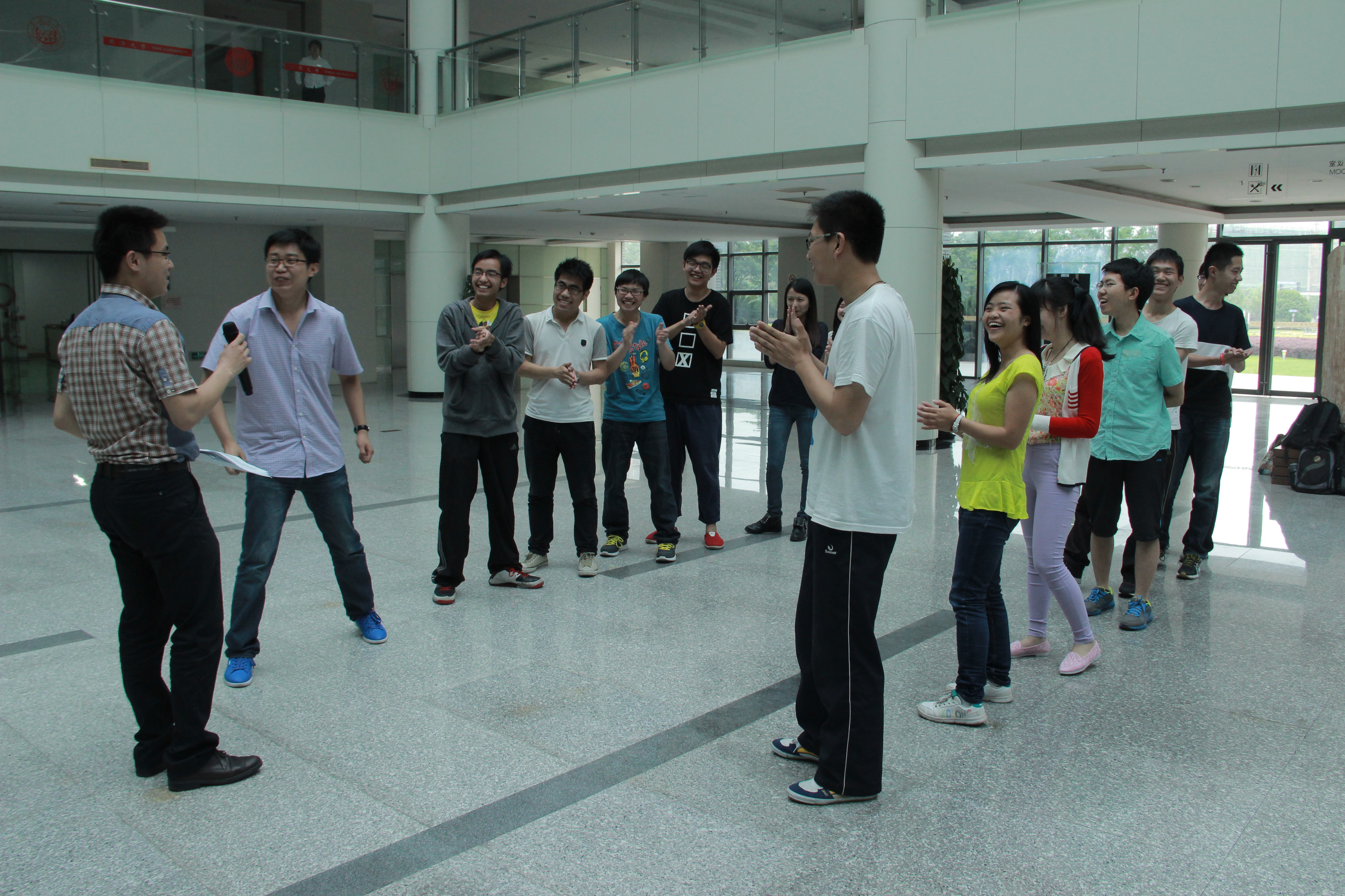 会议结束后,学员们在济人楼大厅集合分成两队进行素质拓展活动。首先,每队给5min时间成员间相互了解并选出队长确定队名。5min过后两队确定了队长及队名(彩虹队、庆鹏队)、成员间也得到了很好的了解。