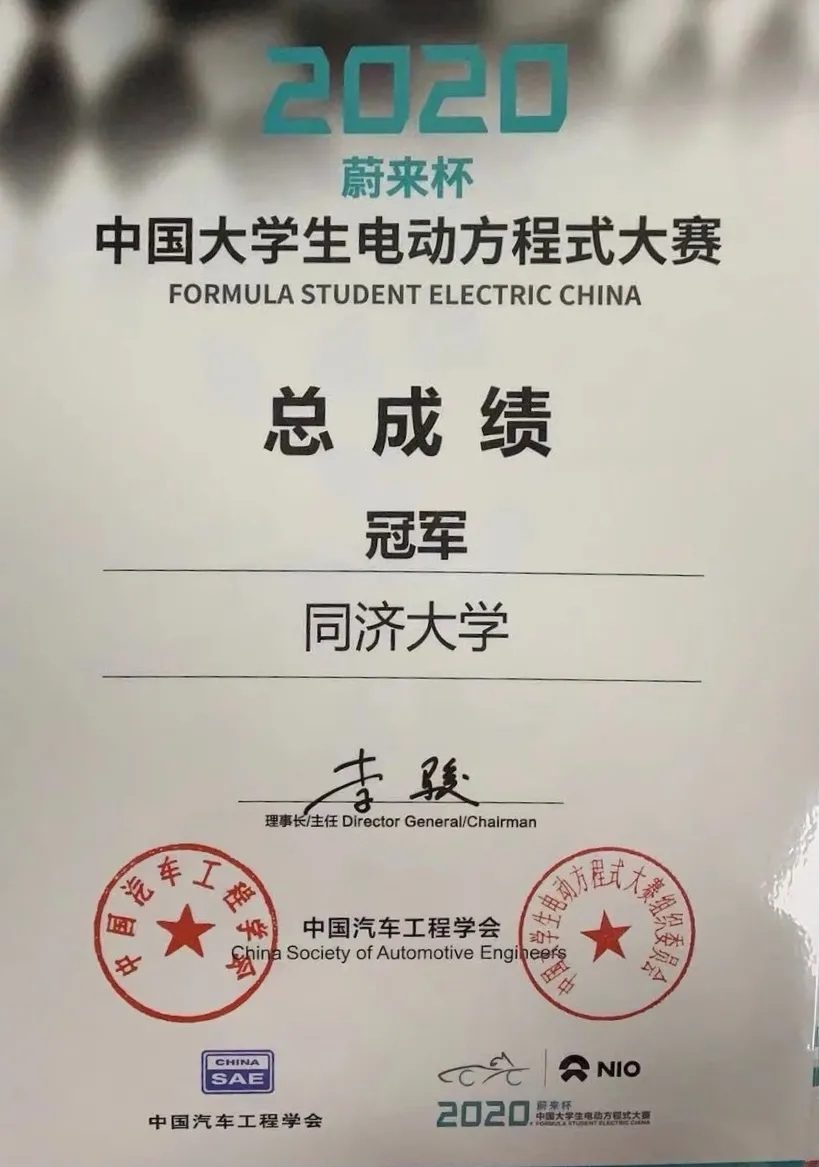 同济电车队获得:中国老员工电动方程式大赛总冠军,其中,设计报告第一名,直线加速第一名,耐久性能第三名,8字绕环第二名。