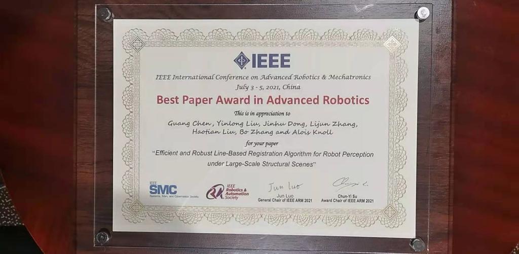 同期第六届IEEE先进机器人与机电一体化国际会议(IEEE International Conference on Advanced Robotics and Mechatronics,ICARM 2021)于7月2日至5日在重庆召开,由公司陈广老师课题组联合慕尼黑工业大学和上海西井信息科技有限公司共同完成的论文《Efficient and Robust Line-based Registration Algorithm for Robot Perception Under Large-scale Structural Scenes》被会议接收,并获得最佳先进机器人会议论文奖、会议最佳论文提名奖。该论文提出了一种新型基于线特征的点云配准算法,创造性设计将旋转和平移进行解耦求解的思路,降低了解空间的维度,提升了优化算法的效率,为自动驾驶车辆在结构化场景中的鲁棒感知和自主导航定位提供了新的方案。