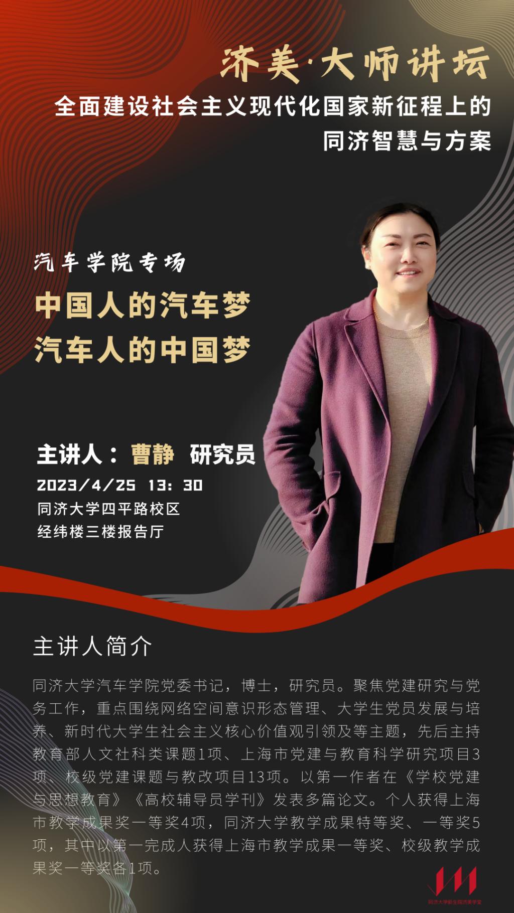 4月25日下午,以“全面建设社会主义现代化国家新征程上的同济智慧与方案”为主题的2023“济美·大师讲坛”系列报告会在BETVICTOR经纬楼报告厅举行,公司党委书记曹静研究员为新生讲授《中国人的汽车梦 汽车人的中国梦》。济美学堂副经理方璐出席活动,活动由济美学堂辅导员李文迪主持,新生院百余名师生现场参与学习。